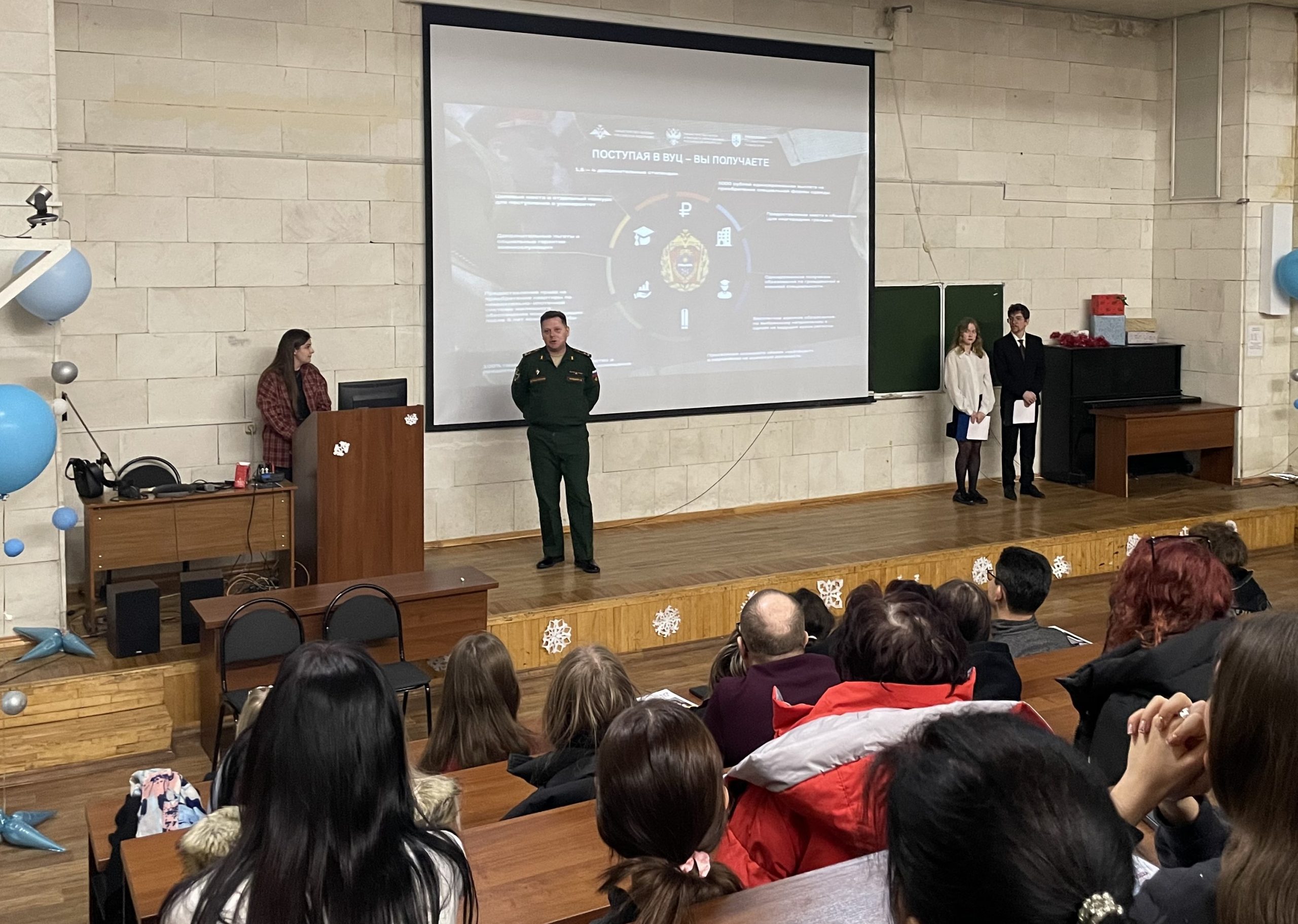 Представители ведущих кафедр военного учебного центра рассказали присутствующим по каким направлениям проходит подготовка, какие вступительные испытания ждут абитуриентов, какую военную специальность получат выпускники.